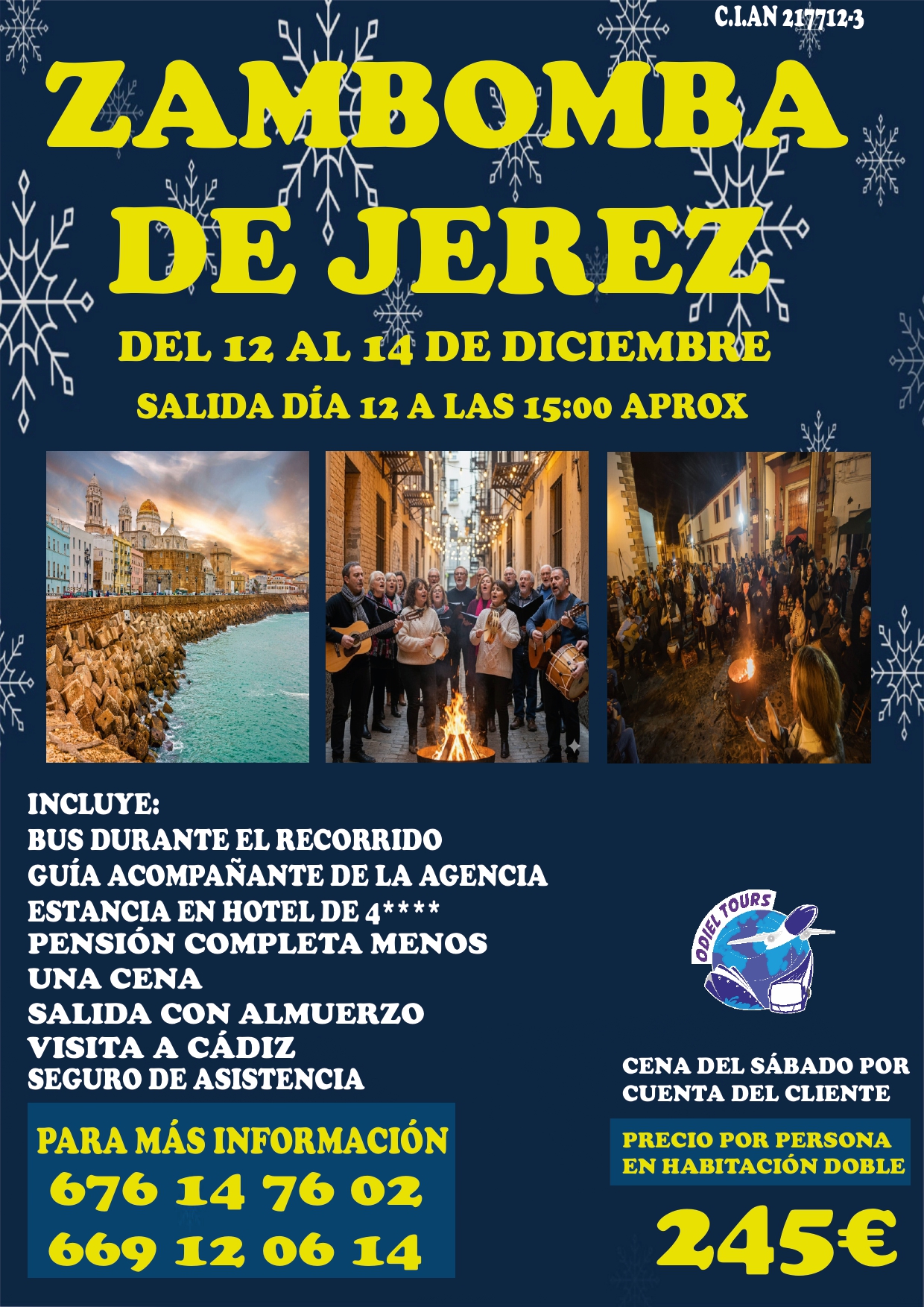 Del 12 al 14 de diciembre, estancia en hotel de 4****, almuerzo en hotel el día de salida, bus de ida y vuelta, visita a Cádiz, guía acompañante de la empresa y seguro de asistencia.